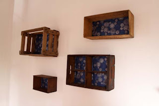 Then I took some tissue paper that I just loved, make sure and buy really big sheets depending on the size of your crates. I cut the paper to fit the boxes and lined the backs. Having tissue paper is nice because it bends and molds without ripping. I just attached it with double-sided tape, but you could use about anything that will adhere it to the wood. They haven’t fallen out yet!